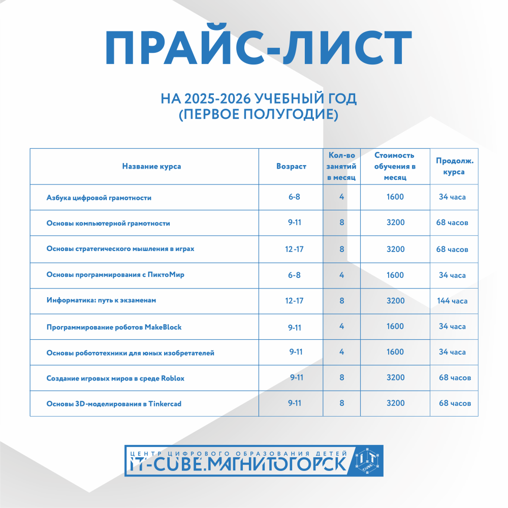 | ДОПОЛНИТЕЛЬНЫЕ НАПРАВЛЕНИЯ | Азбука цифровой грамотности | 34 | Полгода | 6-8 | Внебюджет 1 Азбука компьютерной грамотности | ПТ (16.50-18.20) |