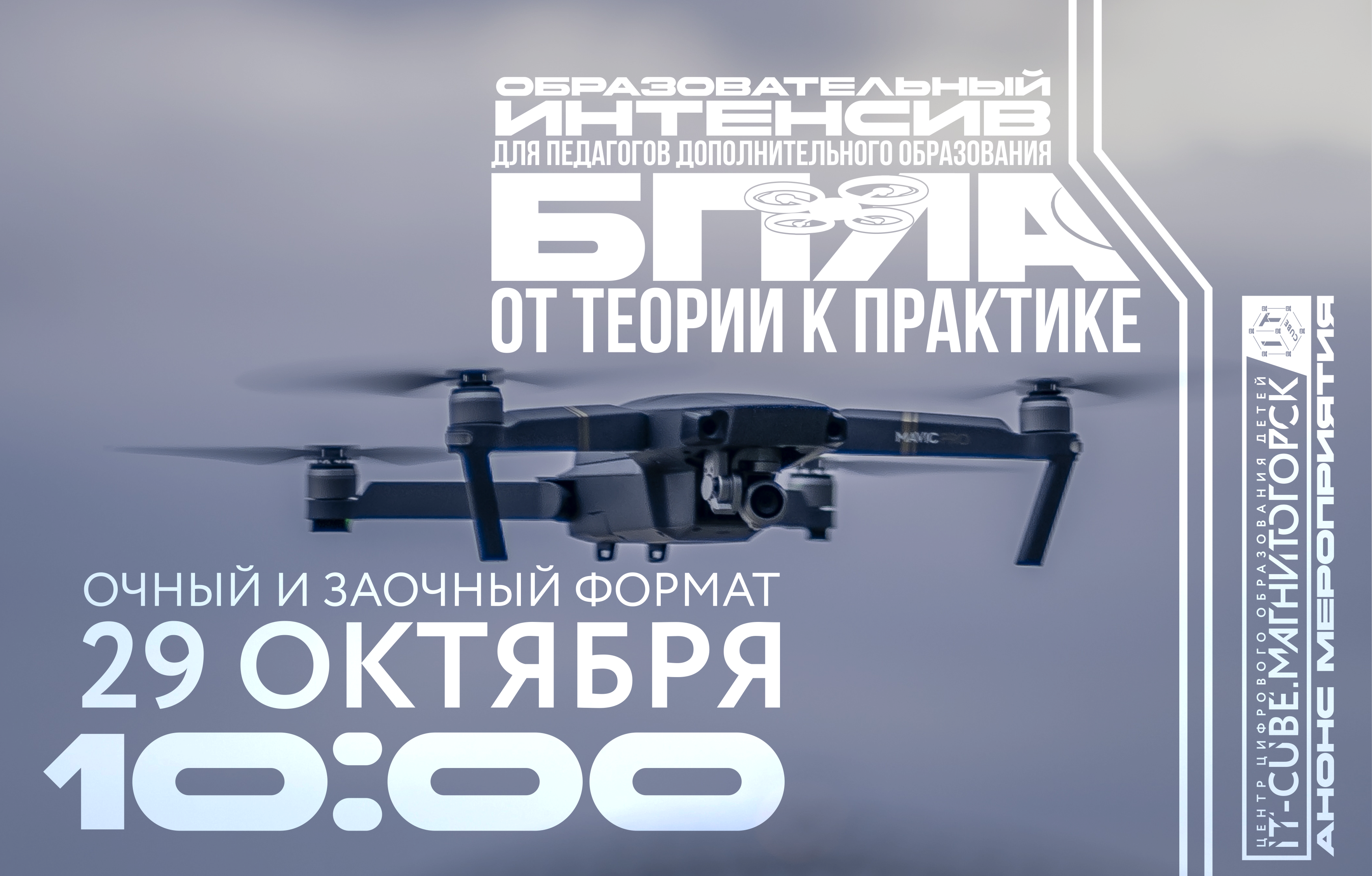 29 октября 2025 года ЦЦОД «IT-куб» г. Магнитогорск проведет образовательный интенсив «БПЛА: от теории к практике» для педагогов дополнительного образования, заинтересованных в развитии направления беспилотных авиационных систем (БАС).