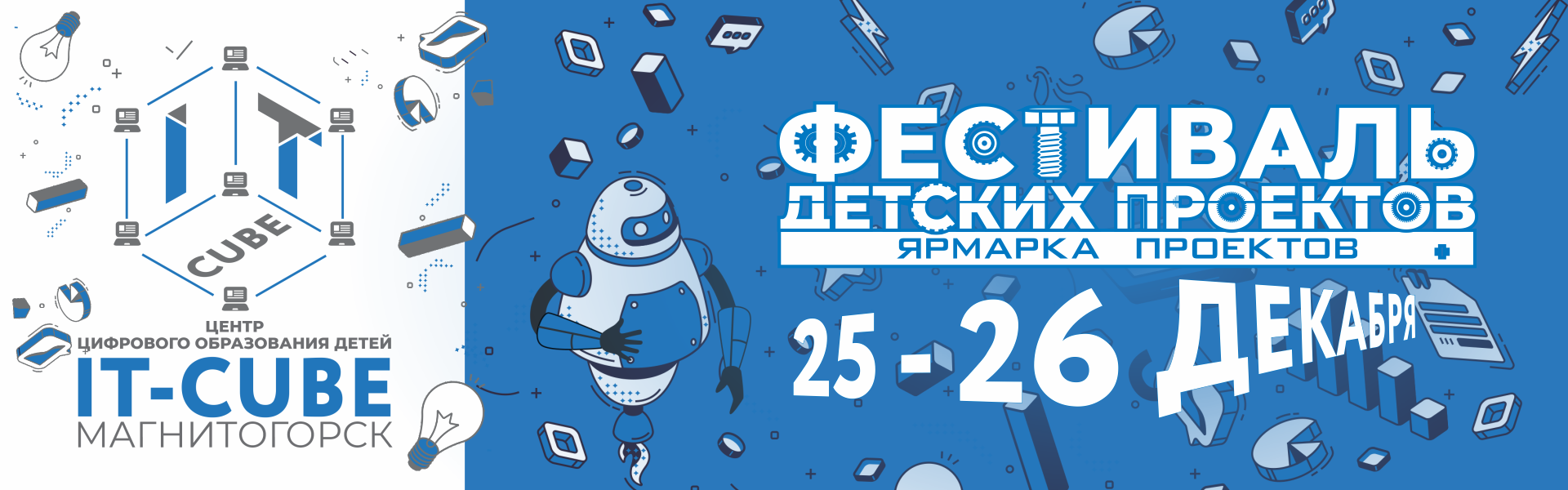 Уважаемые родители и обучающиеся, напоминаем, что в рамках итоговой аттестации центр "IT-куб" проводит Фестиваль детских проектов (ярмарку проектов), который пройдет 25 и 26 декабря. На Фестиваль приглашаются обучающиеся следующих ПОЛУГОДОВЫХ программ: