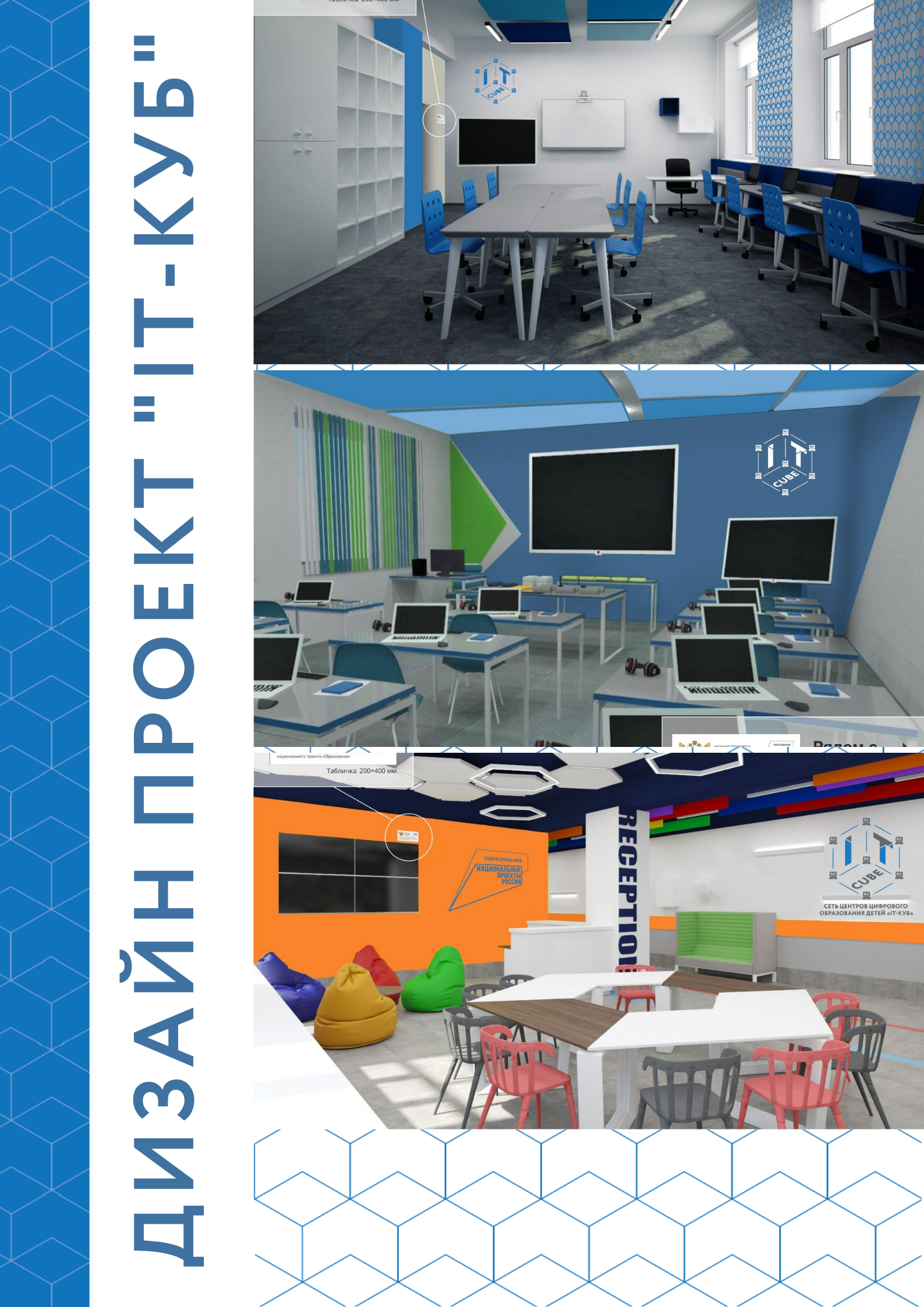 У НАС ВСЕ СТРОГО ПО БРЕНДБУКУ! Минималистичный декор, простая графика. Основные цвета: оттенки белого, серого и синего. Стеклянные двери, необычные потолки - изюминка Центра. На изготовление отправлены элементы брендирования "IT-куб" - наш логотип, информационные стенды и навигационные таблицы.